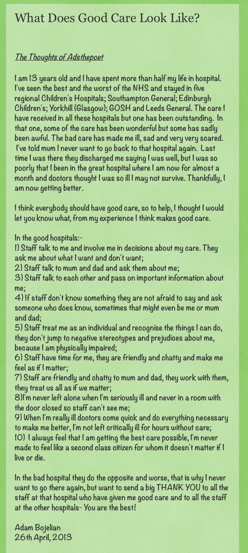 The principles of voice/participation of the child/young person and families/carers not only in their care, but in the design and delivery of services are golden threads that strengthen with each iteration of how we progress the Child Health agenda, here are links to resources that have been developed over the years https://www.england.nhs.uk/participation/get-involved/how/forums/nhs-youth-forum/ Having Gabrielle of the NHS Youth Forum @NHSYouthForum at the table influencing the discussions is an important cultural shift, the transformation programme role modelled from the outset that working with children, young people and families who use services is the only way we can really make progress. The NHS Youth Forum response to the Long term plan demonstrates how passionately they want to be part of the work going forward in local health care systems as well as at a national level https://www.byc.org.uk/news/nhs-youth-forum-responds-to-nhs-long-term-plan